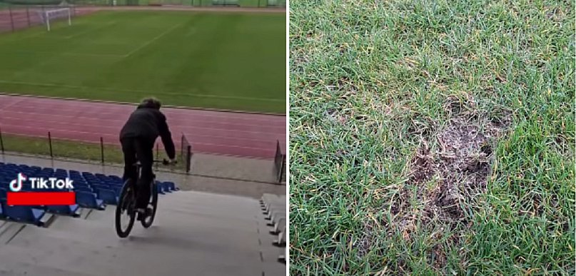 Wandal na rowerze zniszczył murawę stadionu. "Serce pęka jak człowiek to widzi"