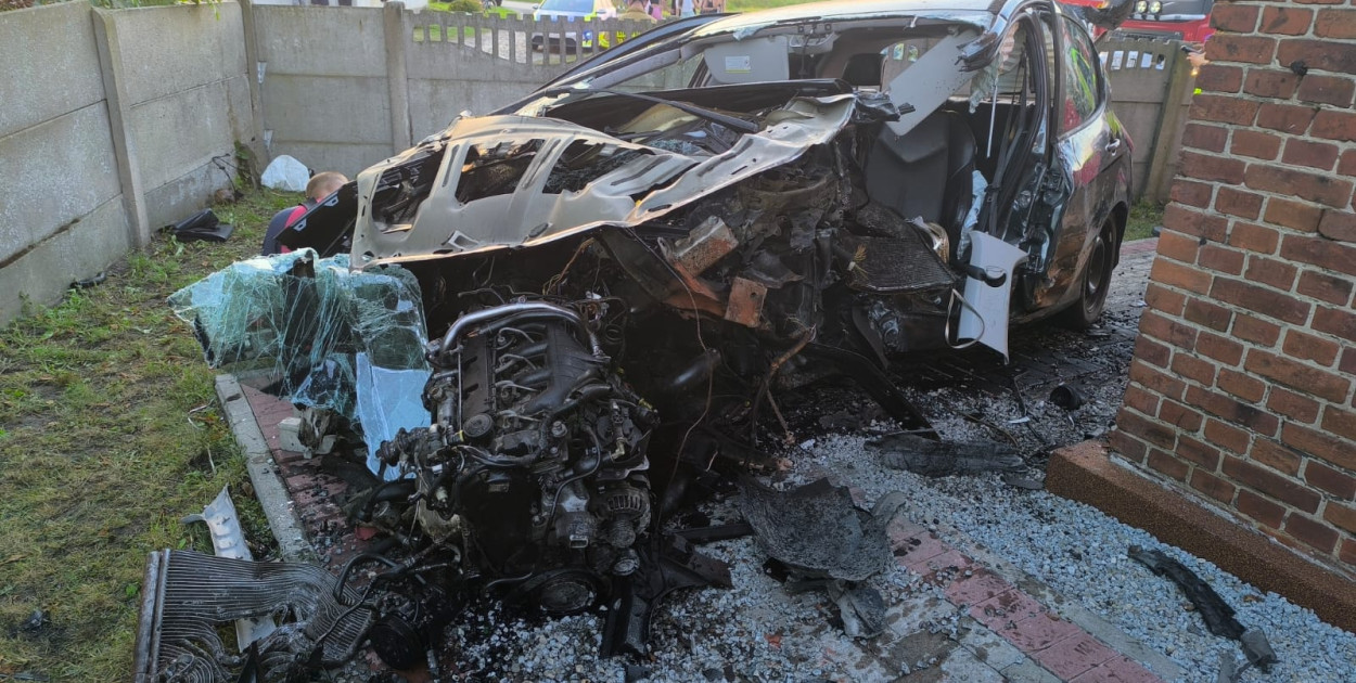 Jedno auto dodatkowo uderzyło w budynek świetlicy wiejskiej uszkadzając elewację i zatrzymało się tuż przy ścianie szczytowej obiektu.