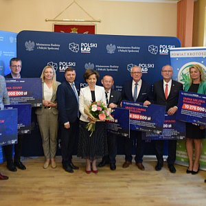 Samorządy z powiatu krotoszyńskiego otrzymają w sumie 77 milionów złotych na 13 inwestycji w ramach dofinansowań z drugiej edycji Rządowego Funduszu Polski Ład - Programu Inwestycji Strategicznych. Z tej okazji przyjechali do Krotoszyna wspomniana minister oraz posłowe PiS-u Jan Mosiński i Tomasz Ławniczak.