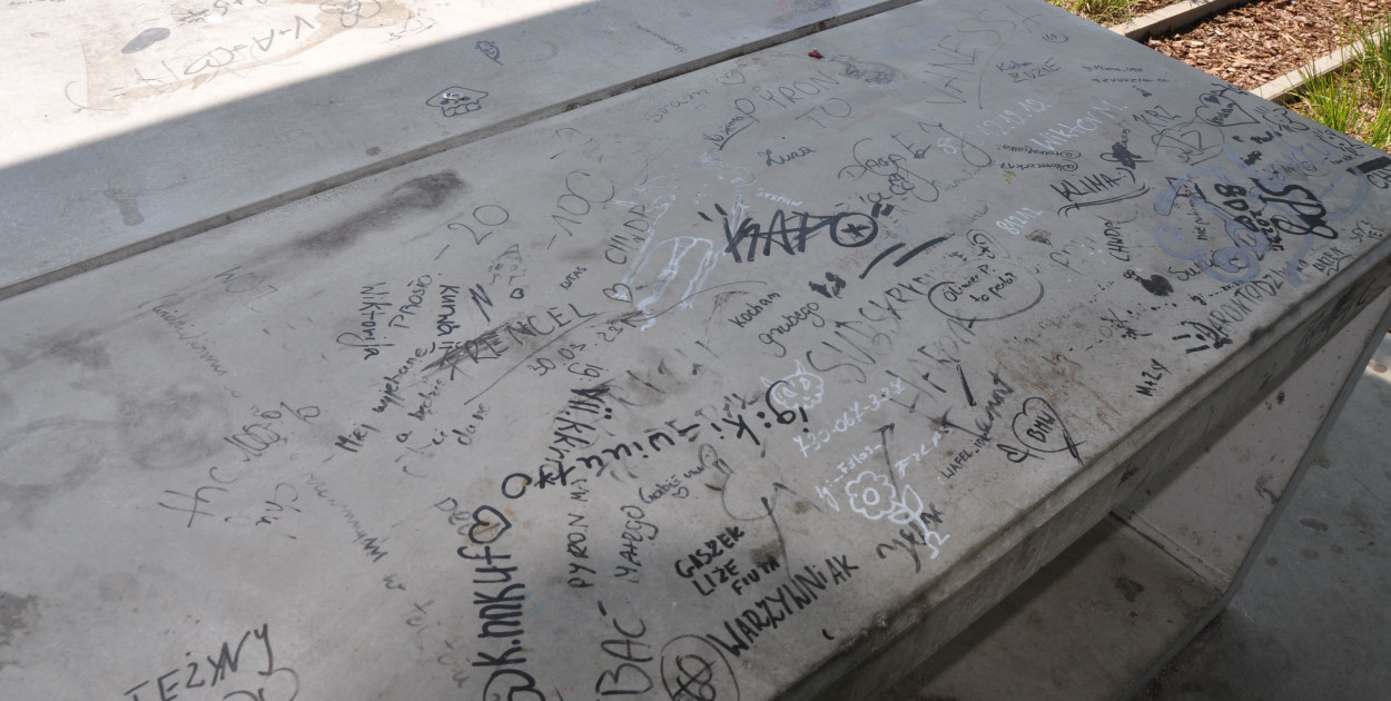 Betonowe ławki i stoły noszą ślady działalności domorosłych grafficiarzy. Chociaż to byłaby obelga dla prawdziwych artystów tworzących ładne malunki na ścianach w przestrzeni publicznej. To są po prostu bezczelni i niewychowani smarkacze, którzy niszczą wspólną własność. Piszą imiona, wulgarne słowa, rysują męskie genitalia i inne obrazki.
